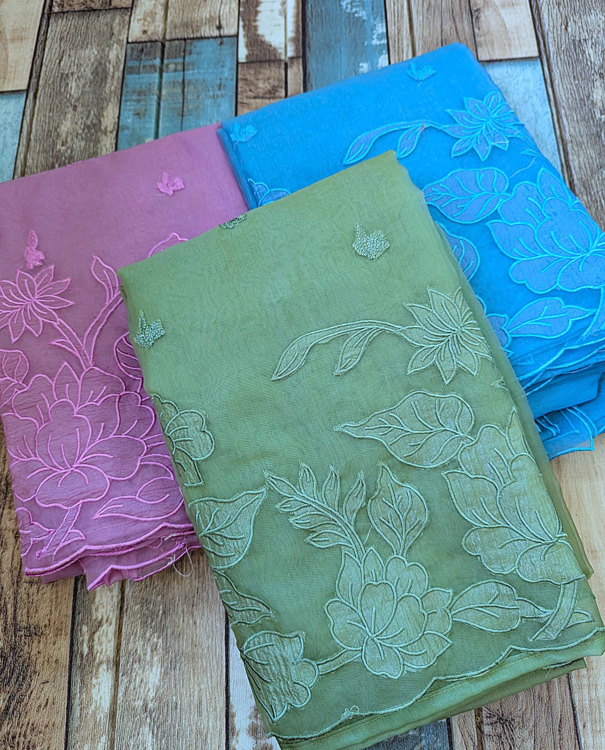 Elevate your ethnic wardrobe with this elegant Appliqué Embroidered Organza Material and Dupatta Set, designed for a graceful and refined look. Crafted from lightweight organza fabric, this ensemble features delicate floral appliqué embroidery that adds a soft, luxurious charm. Paired with a plain bottom, it offers a perfect balance of style and comfort—ideal for festive occasions, casual gatherings, or semi-formal wear.