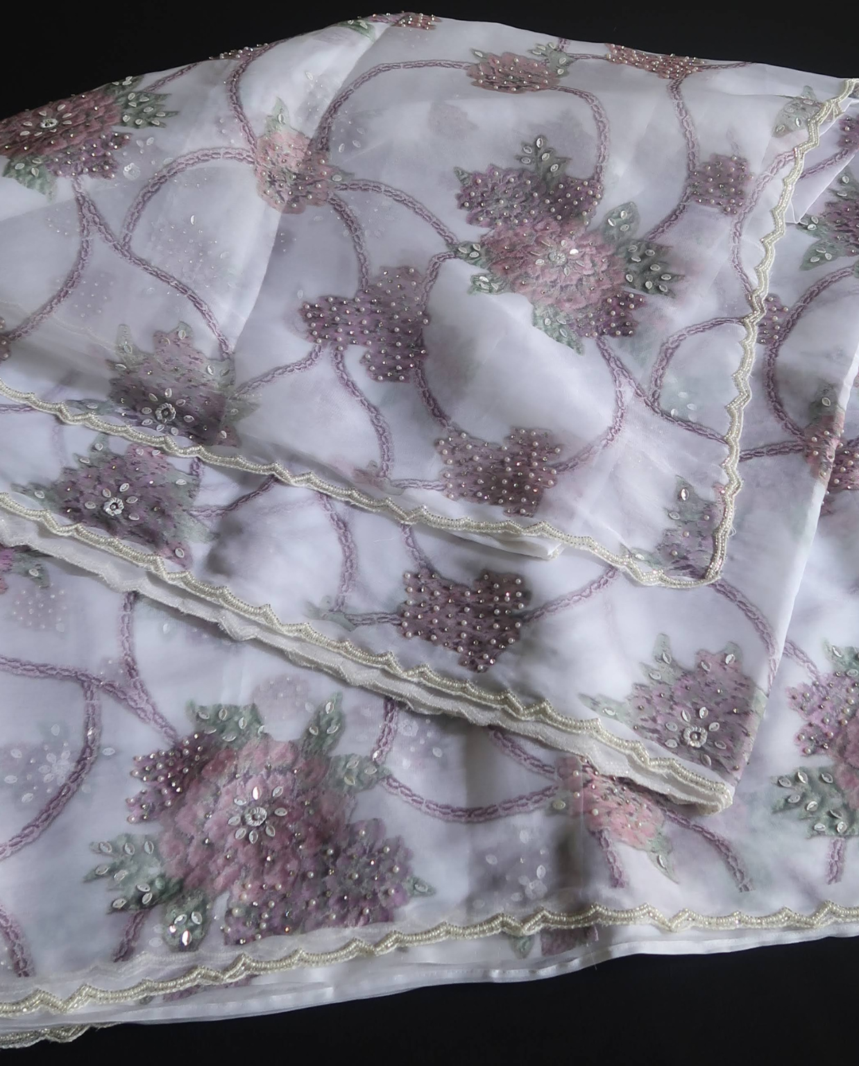 This is a handworked chiffon organza saree featuring delicate floral embroidery with sequins, cutbeads, and stones @5500 with free shipping