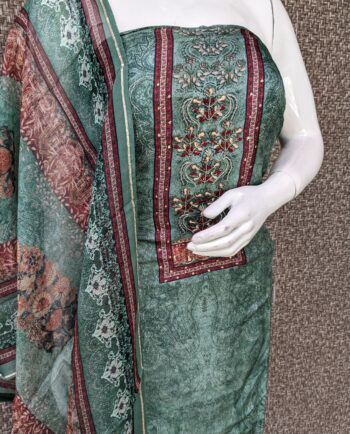 Hand Embroidered Viscose Organza Top paired with Digital Printed Organza Dupatta and Santoon Bottom